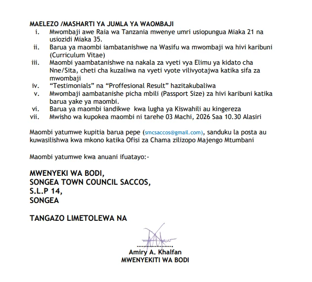 Job Vacancies at Songea Town Council Saccos Ltd 2026 | Nafasi za Kazi Kutoka Saccos LTD