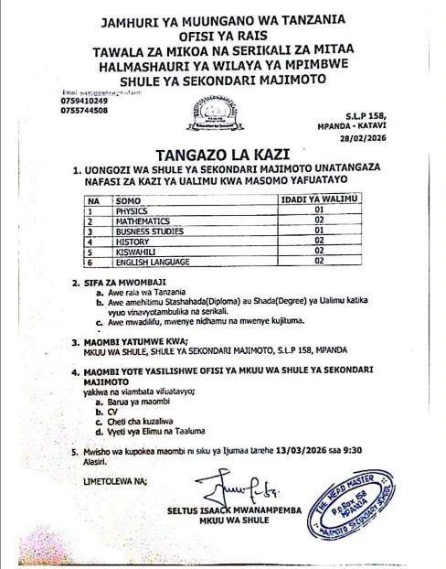 - The Management of Majimoto Secondary School announces teaching job vacancies in the following subjects: