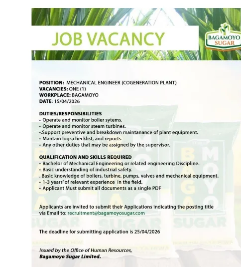 Bagamoyo Sugar Limited is seeking a qualified and motivated Mechanical Engineer to join our team at the Cogeneration Plant. This is an excellent opportunity for a technical professional looking to grow within the industrial energy sector.