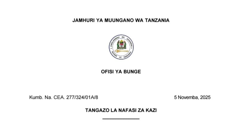 Nafasi za Kazi Bunge la Muungano Tanzania
